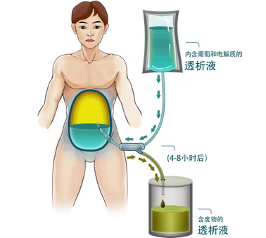 腹膜透析[2] (Peritoneal Dislysis,PD)是利用腹膜的半透膜特性,向腹腔內(nèi)規(guī)律、定時(shí)注入透析液,膜一側(cè)毛細(xì)血管內(nèi)血漿和另一腹腔內(nèi)透析液借助溶質(zhì)濃度梯度和滲透梯度,通過(guò)彌撒、對(duì)流和超榕的原理。以清除體內(nèi)潴留的代謝廢物和過(guò)多的水分,糾正酸中毒和電解質(zhì)紊亂,同時(shí)通過(guò)透析液補(bǔ)充所必需的物質(zhì)。